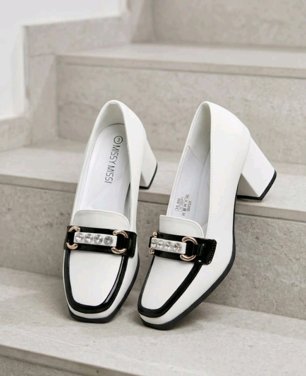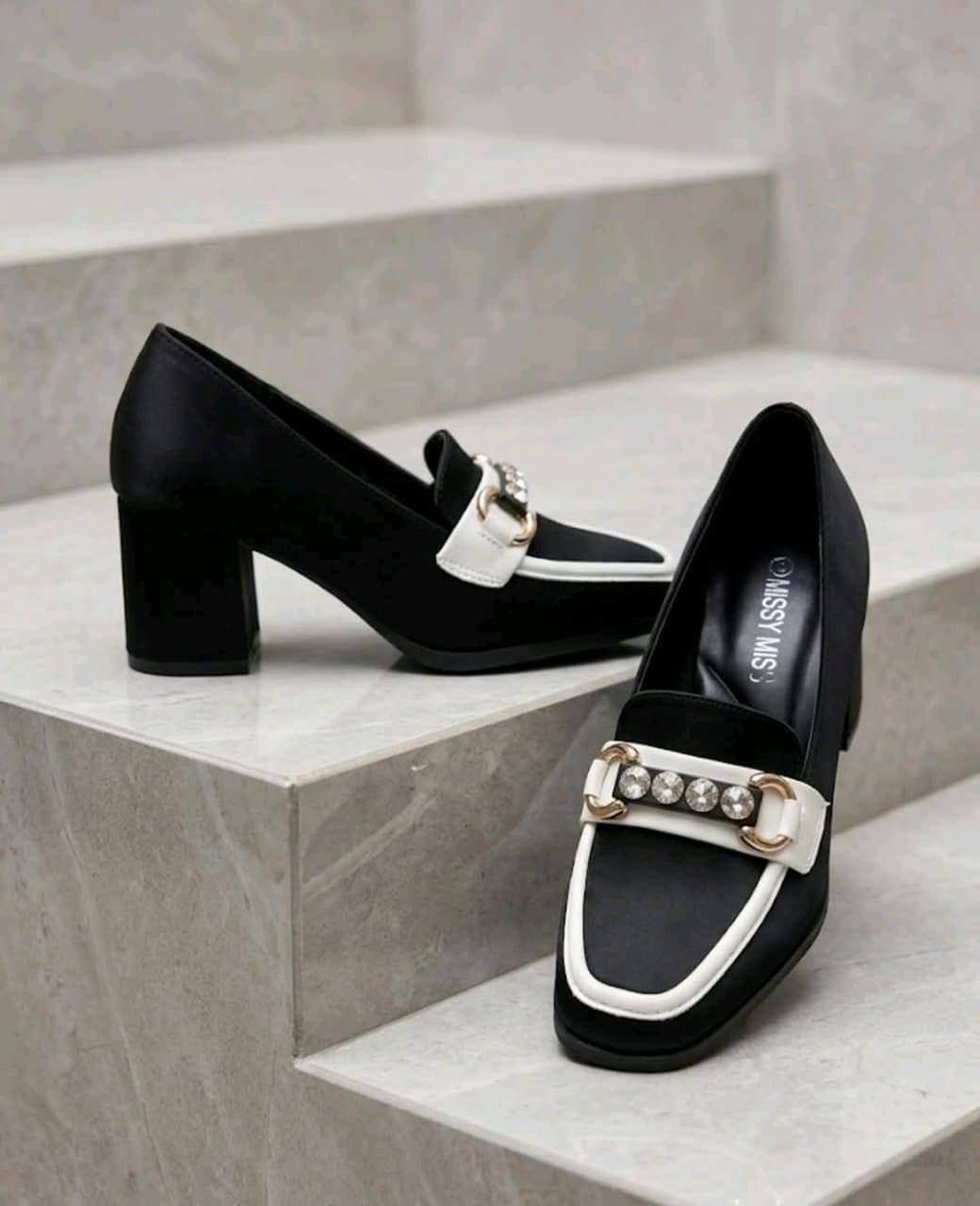 • Design: These shoes feature a black suede-like upper with a contrasting white vamp and a decorative crystal-embellished strap.