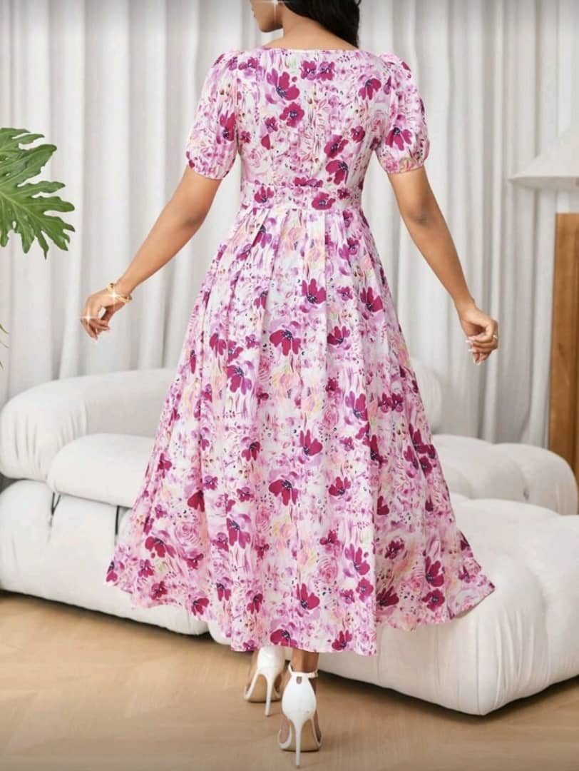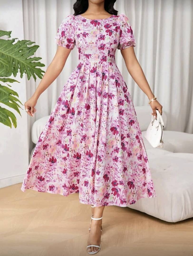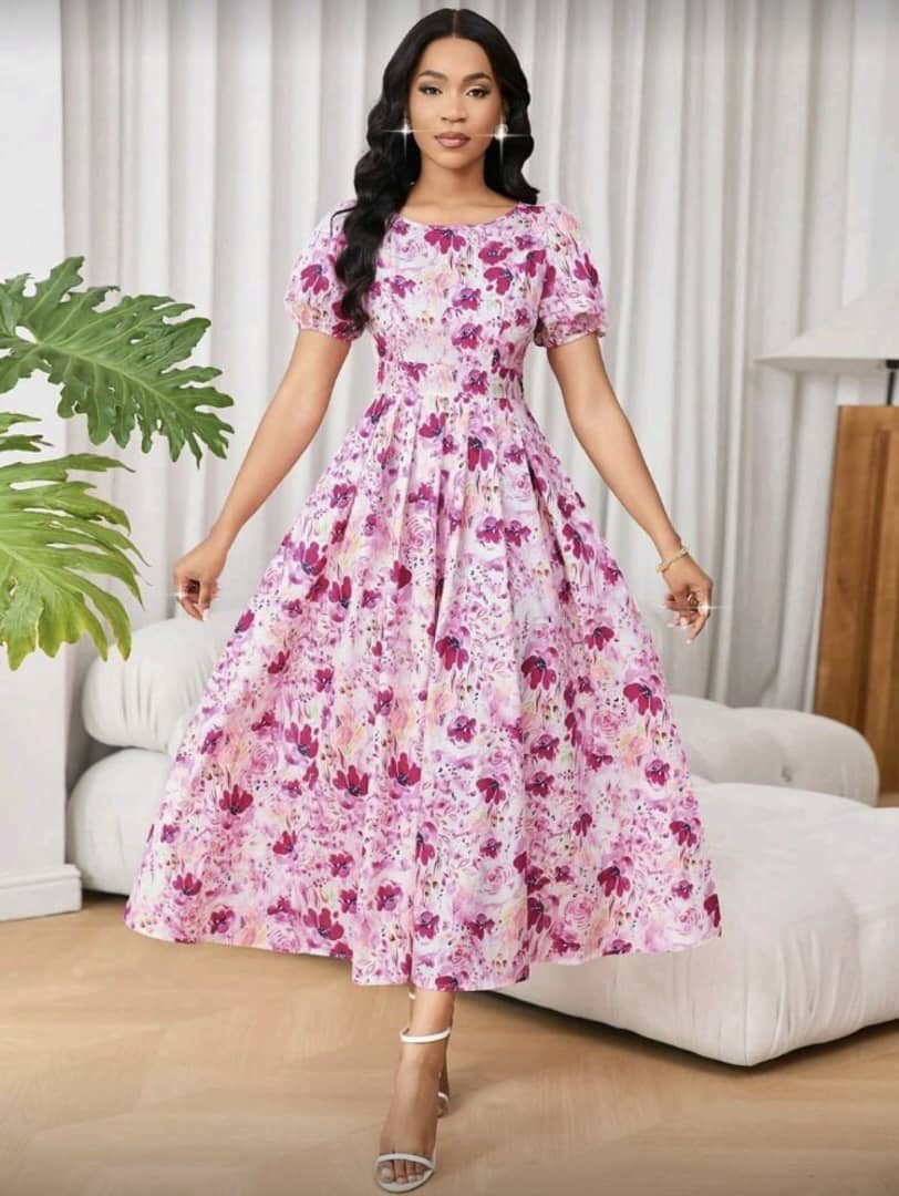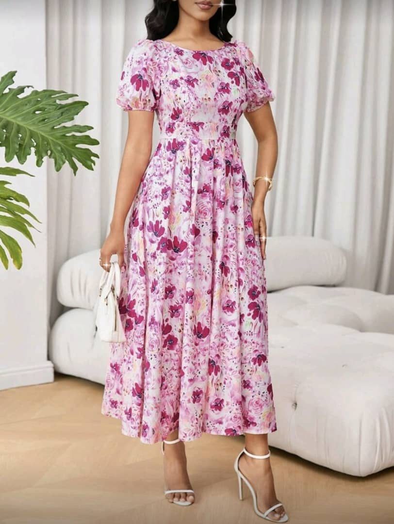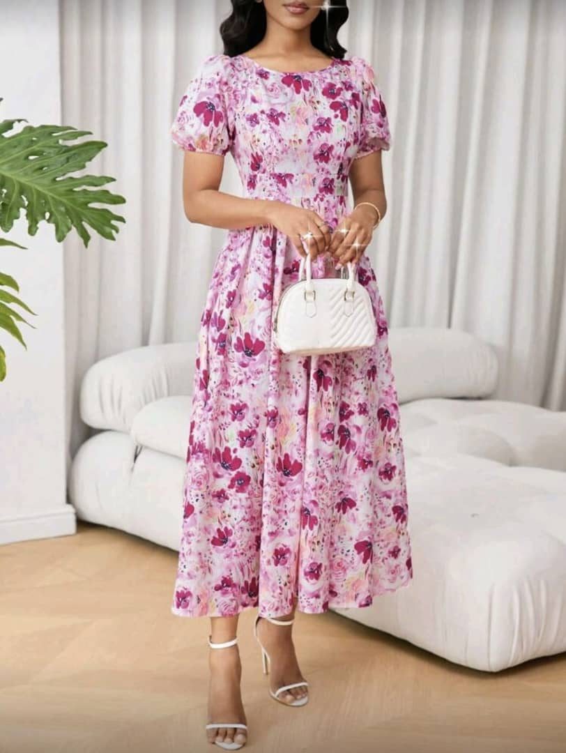 This dress features a vibrant floral print . It has puffed sleeves and a fitted bodice that cinches at the waist before flowing into a full, midi-length skirt. The overall style suggests a feminine and modest aesthetic, suitable for various occasions.Â