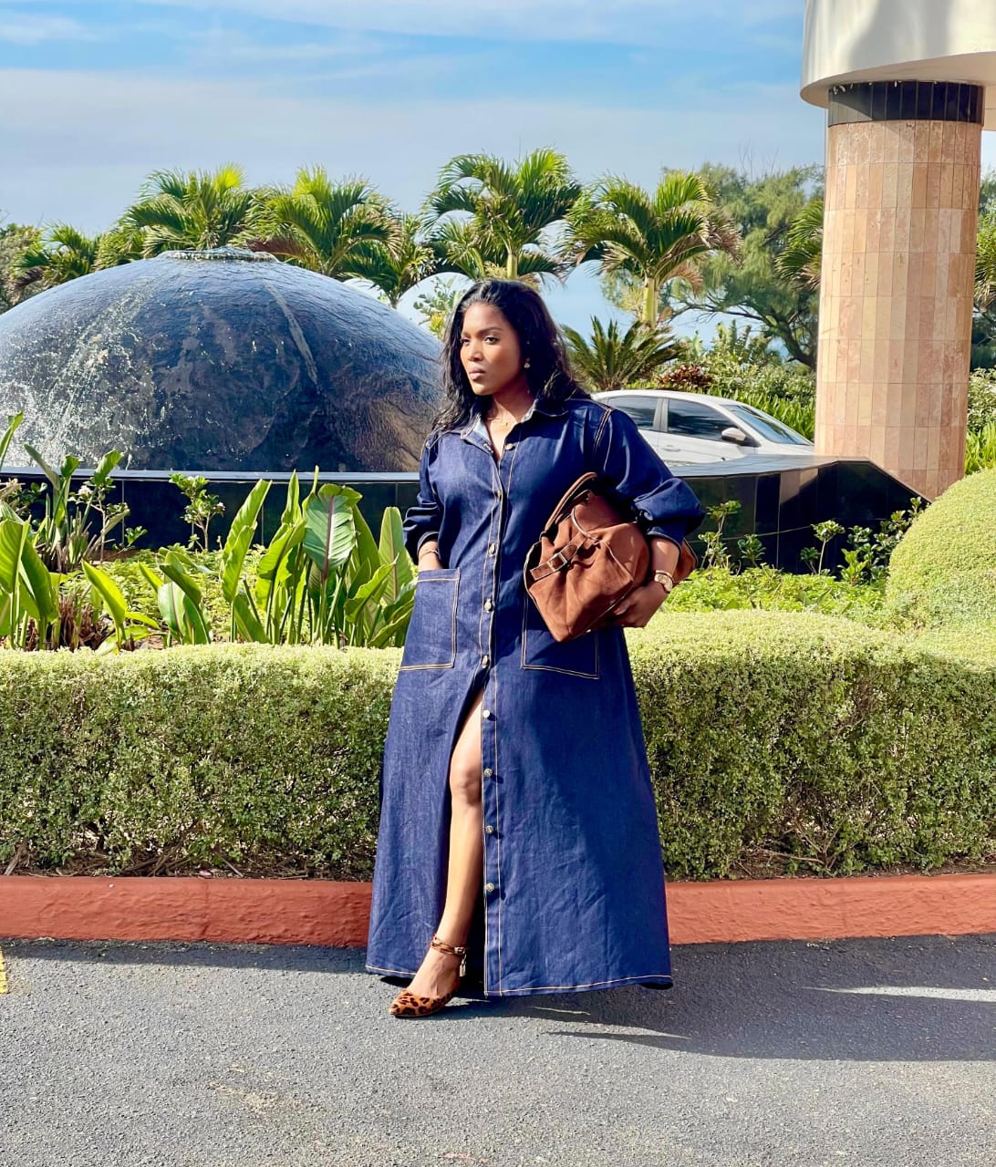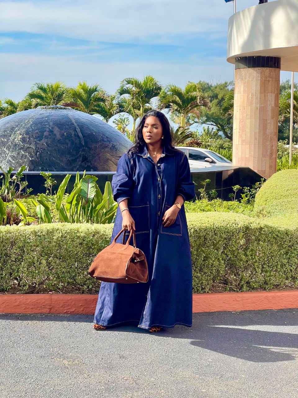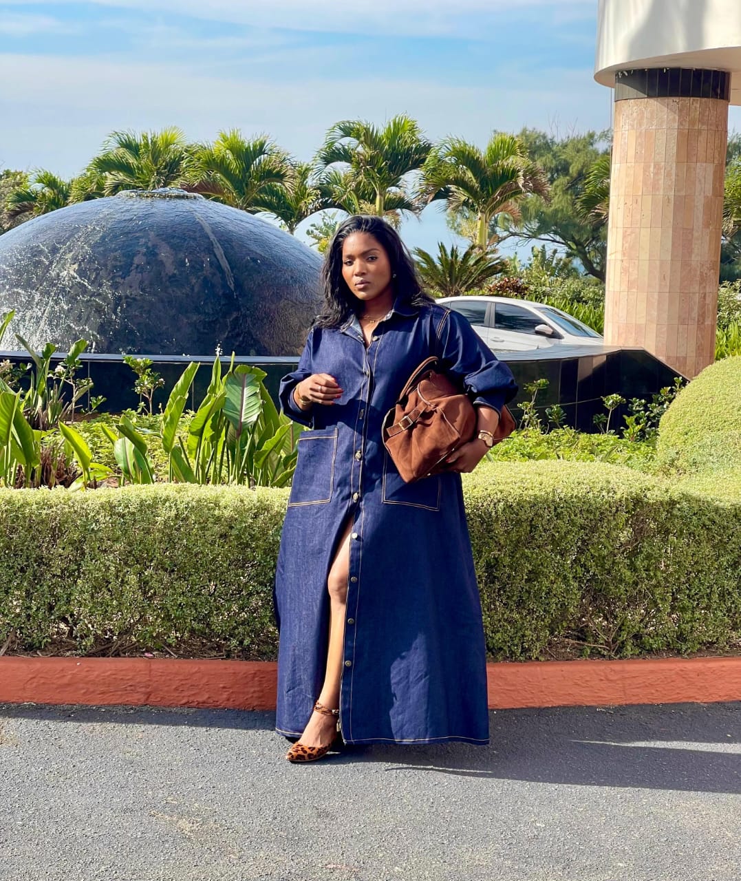 • Silhouette: A floor-sweeping A-line or straight-cut maxi dress. The button-down front can be worn fastened all the way down or left unbuttoned to create a high, dramatic front slit.