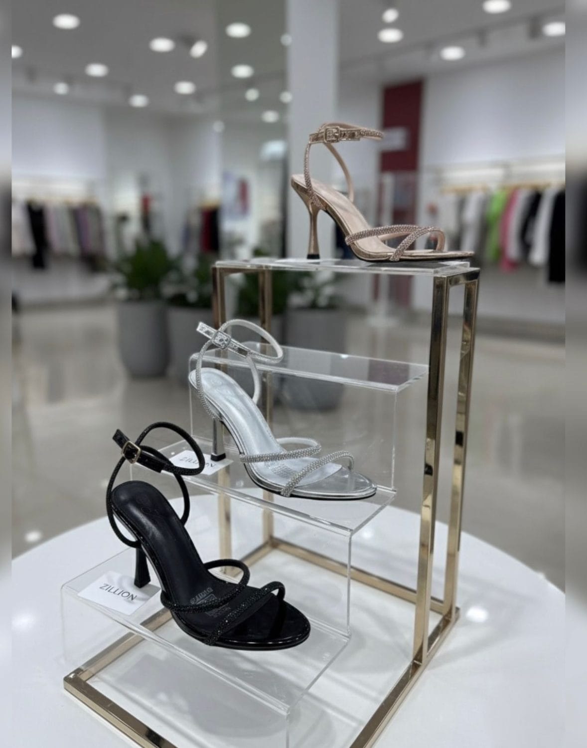 The shoes are all high-heeled sandals with stiletto heels and ankle straps.These are open-toe sandals with a stiletto heel and an ankle strap with a buckle closure. The straps have a subtle texture or embellished detail, and the heel is covered in the same material.