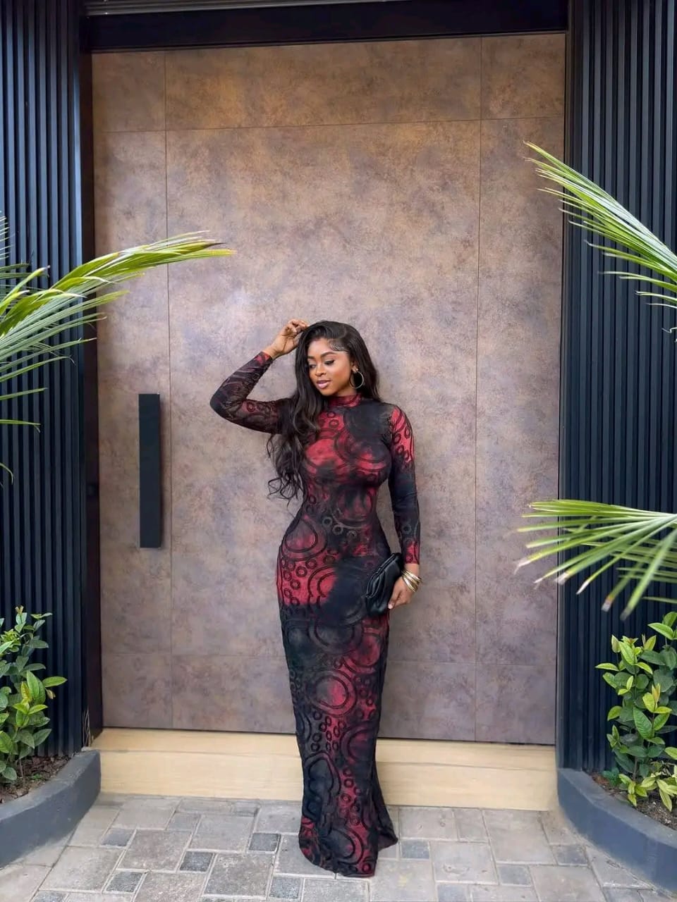 • Silhouette: A dramatic, full-length bodycon cut that tightly hugs the figure from the neckline down to the ankle.