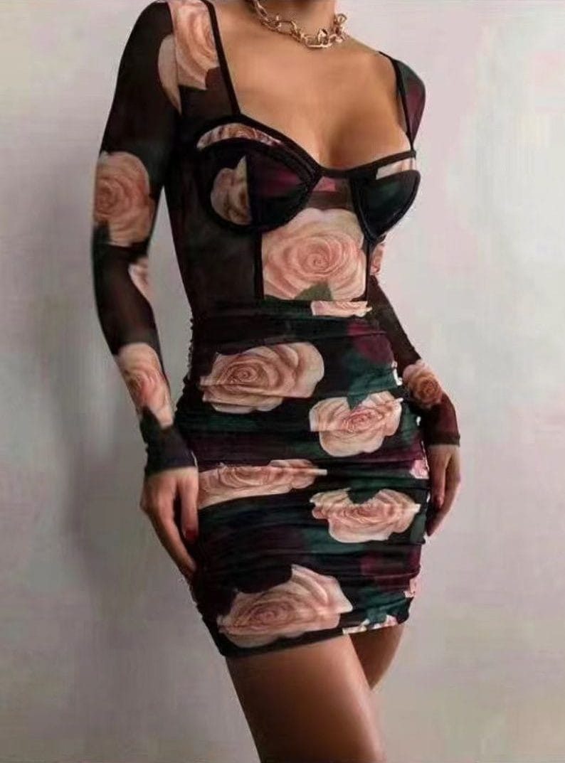 Dinnergirl Bodycon Floral Long Sleeve Dress (333)