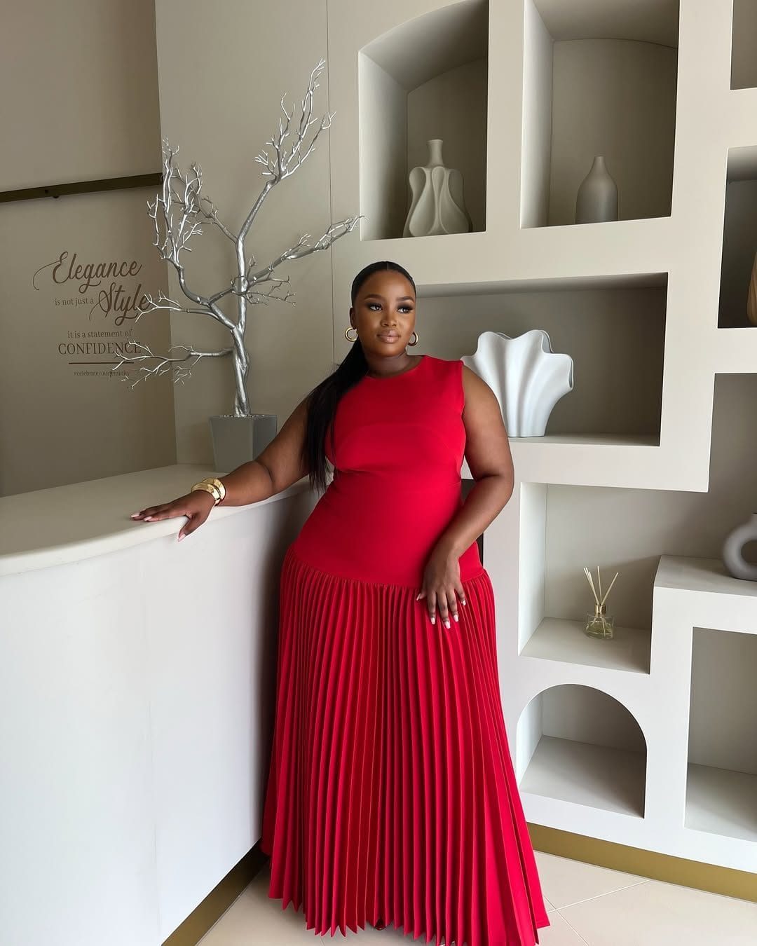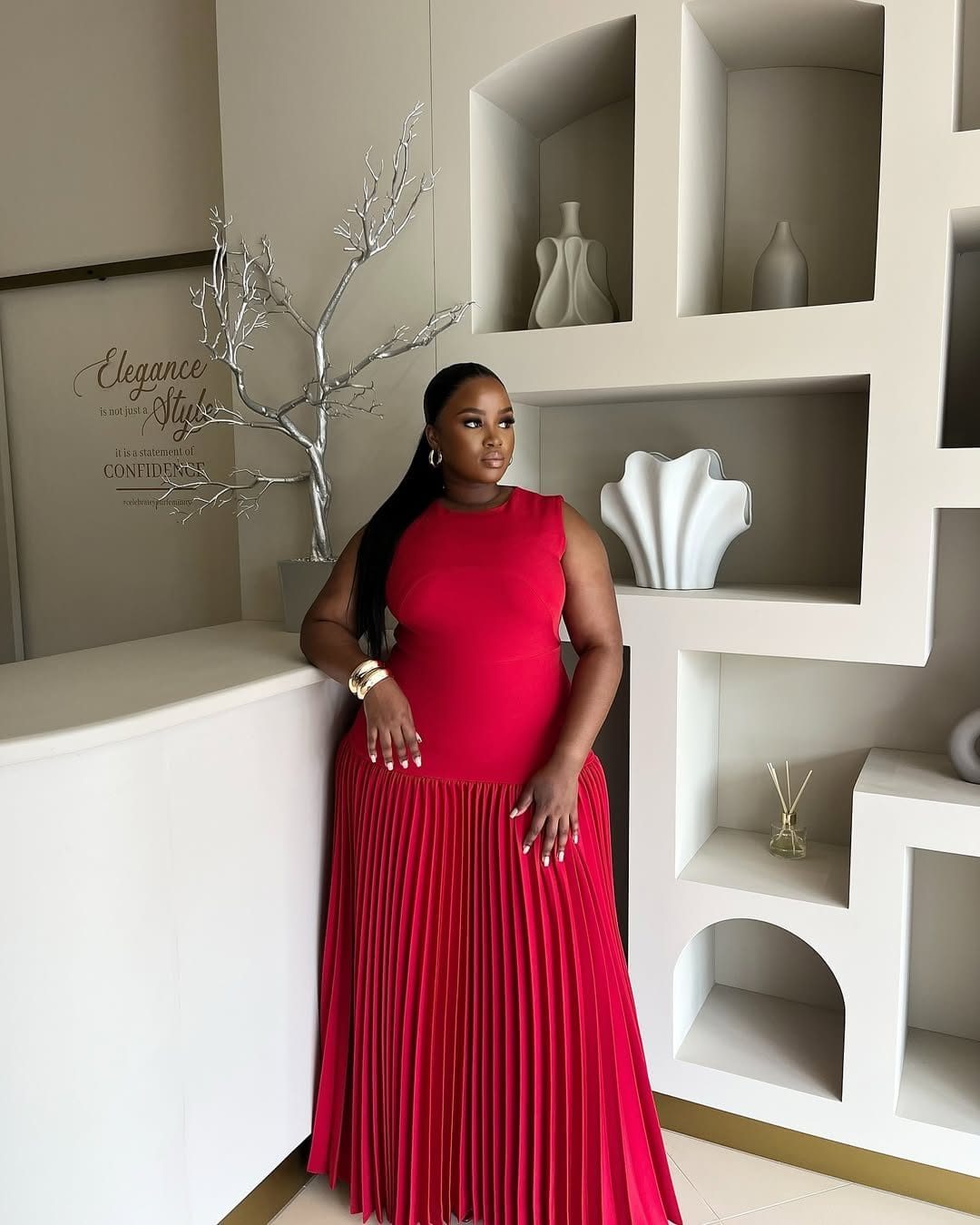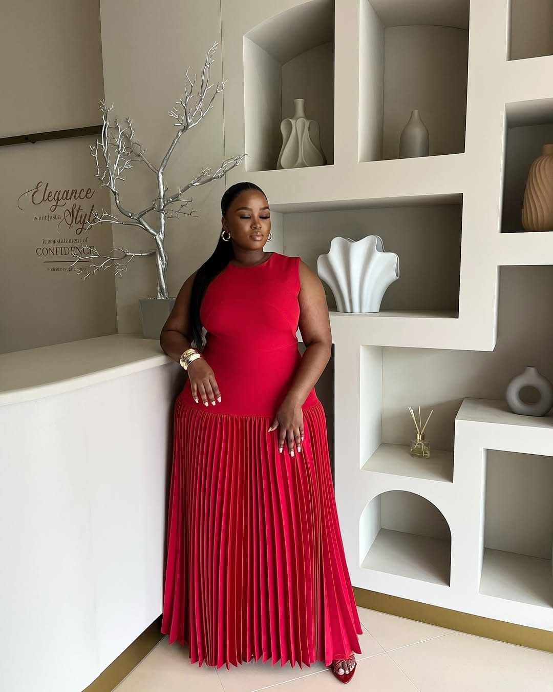 Make a bold statement in this striking sleeveless maxi dress, designed to command attention. The dress features a beautifully ruched or fitted bodice that provides a form-flattering silhouette, while a high neckline offers a sophisticated touch. The most captivating feature is the full, pleated skirt that cascades down to the floor, creating a dramatic sense of movement and elegance. The dress appears to be made from a fabric that holds pleats well, such as a sturdy knit or chiffon blend, ensuring a stunning visual effect with every step. This versatile piece is perfect for red carpet events, weddings, formal dinners, or any occasion where you want to make a lasting impression.