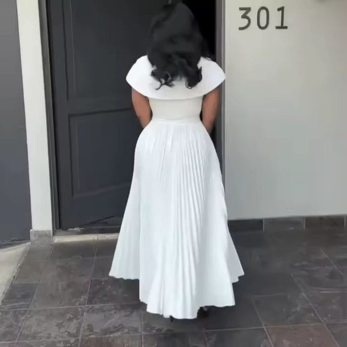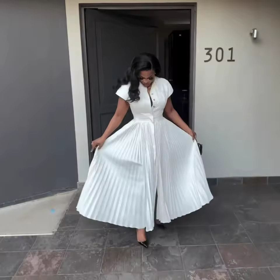 a button-up top section and a wide pleated skirt. It is also known as a pleated shirtdress. The dress has a collar and short cap sleeves, with buttons running down the bodice. The cinched waist is often defined by a belt, which emphasizes the full, flowing A-line shape of the pleated skirt. This style is versatile and can be worn for various occasions.