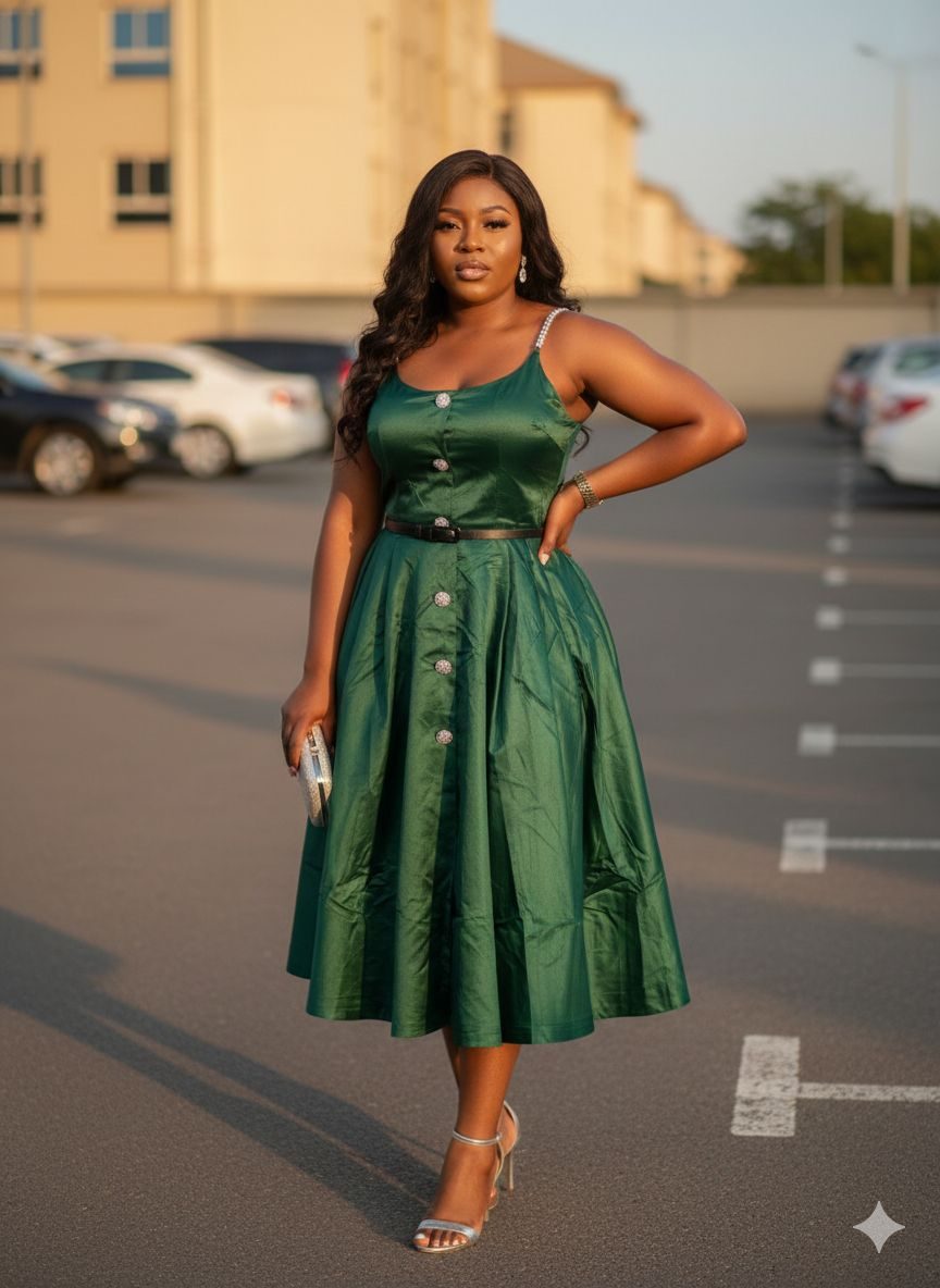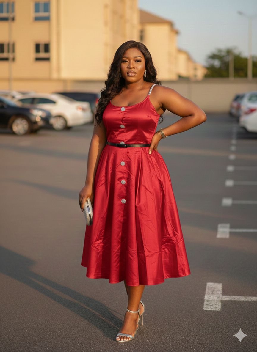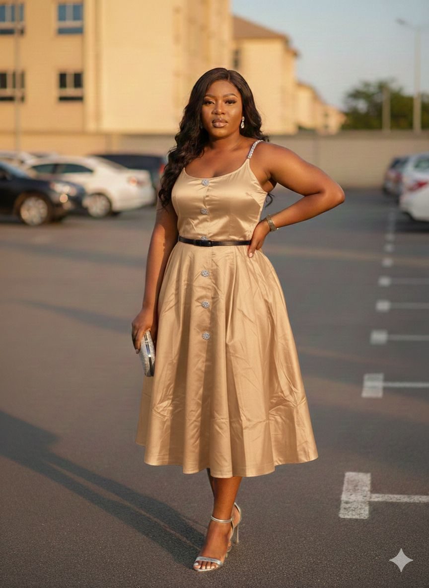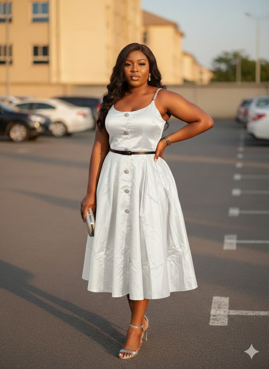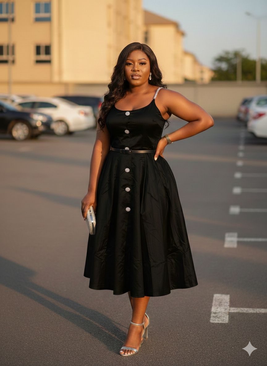 • Design Details: It has a flattering, fitted bodice with a square neckline and delicate, rhinestone-embellished spaghetti straps. Large, black buttons run vertically down the front of the bodice and the skirt. A black belt cinches the high waist, which then flows into a voluminous A-line midi skirt with practical side pockets.