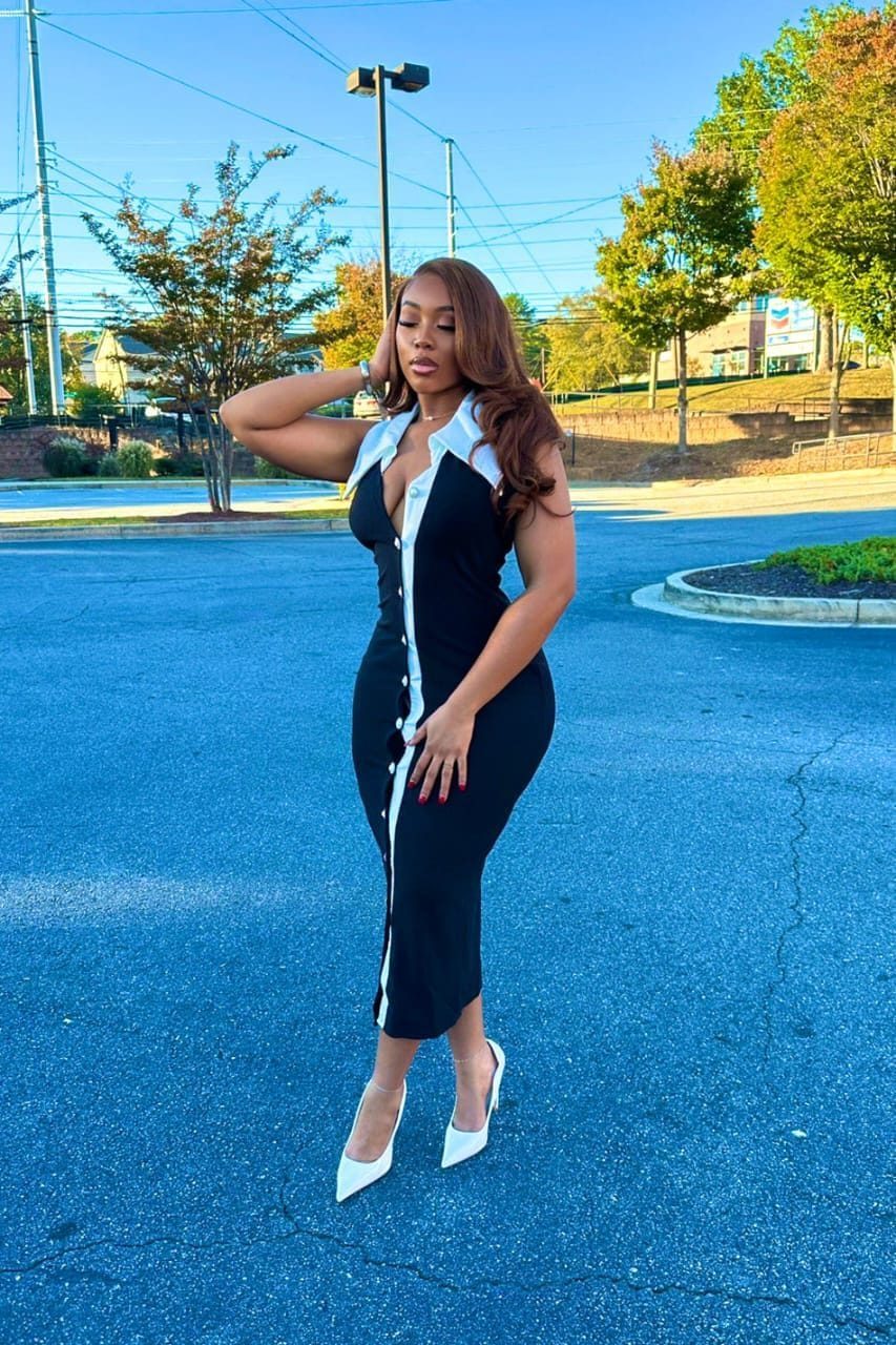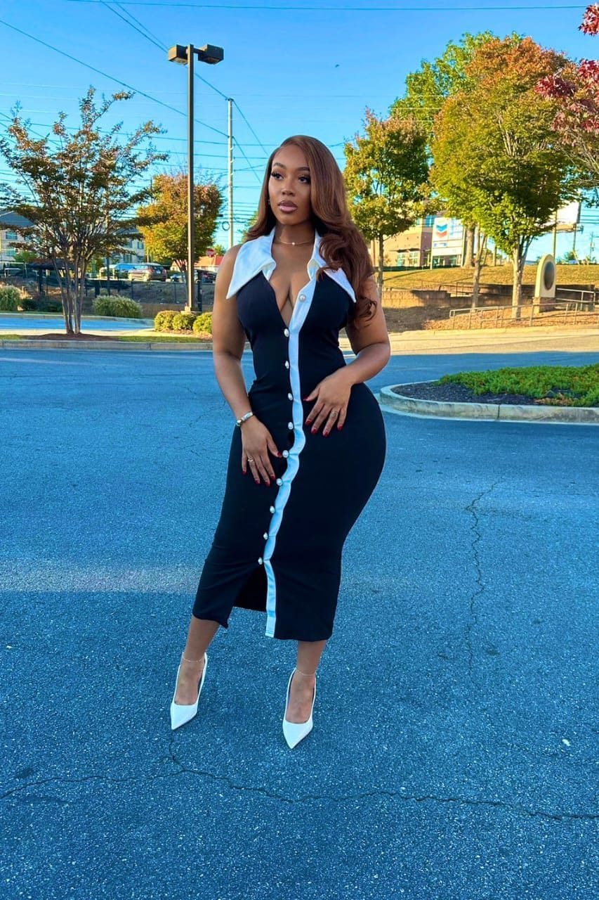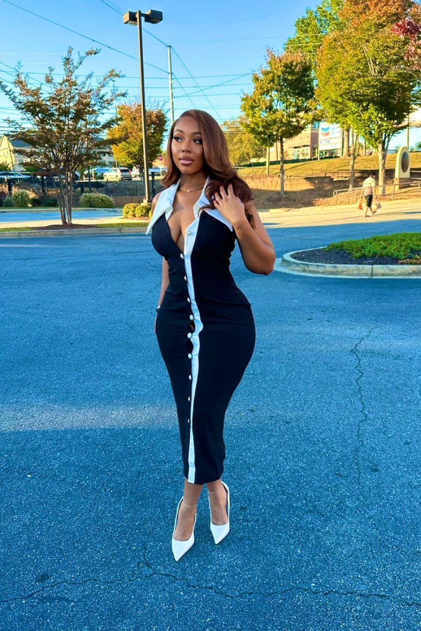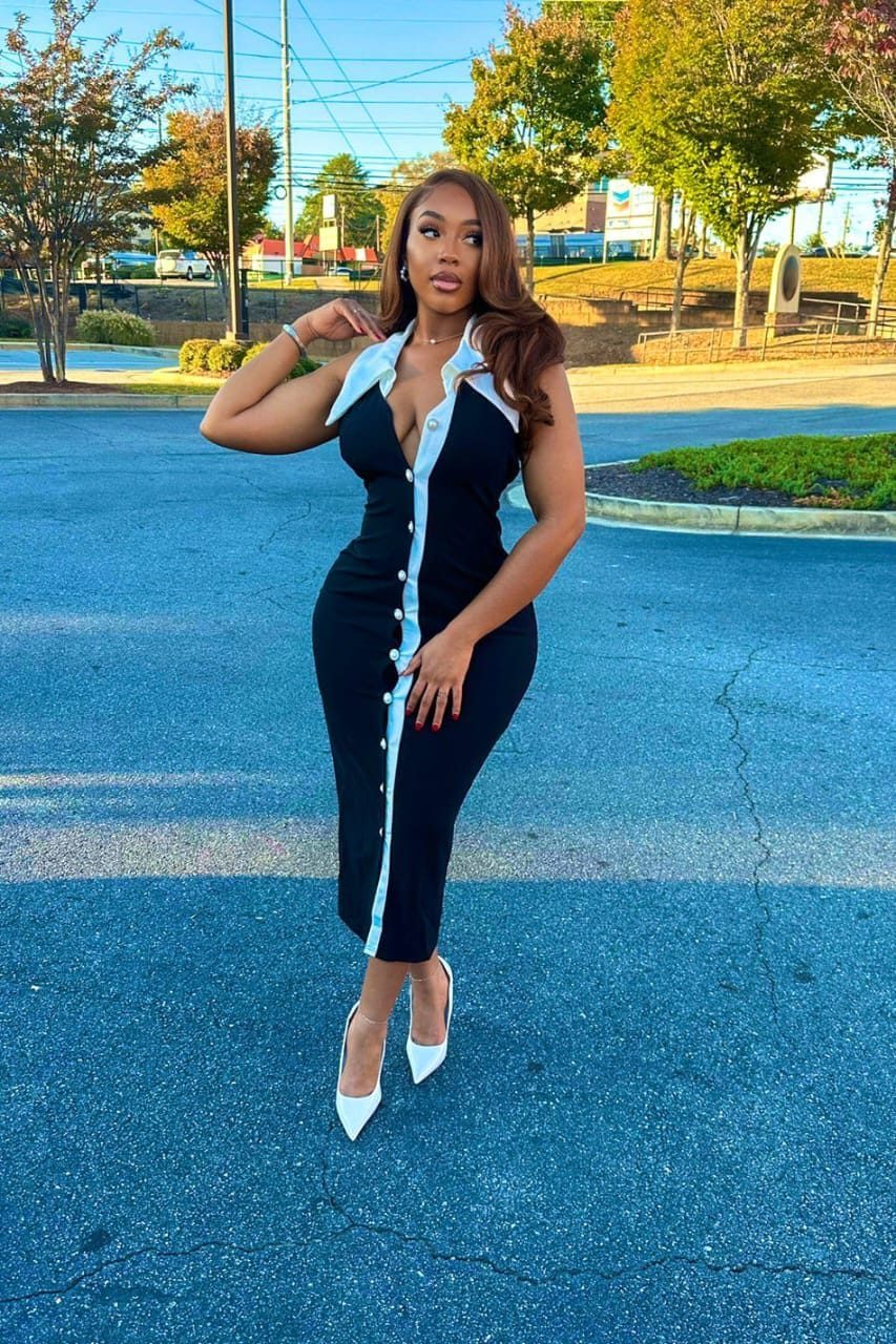 a contrast collar and a button-down front. The style is often described as a collared or contrast-paneled dress. Similar items are available from various online retailers under names like “Casual Contrast Color Knitted V-Neck Sleeveless Slim Fit Dress” and “Full Schedule Maxi Dress