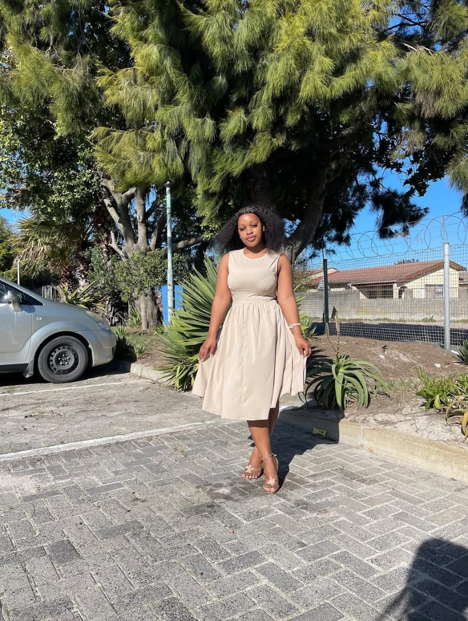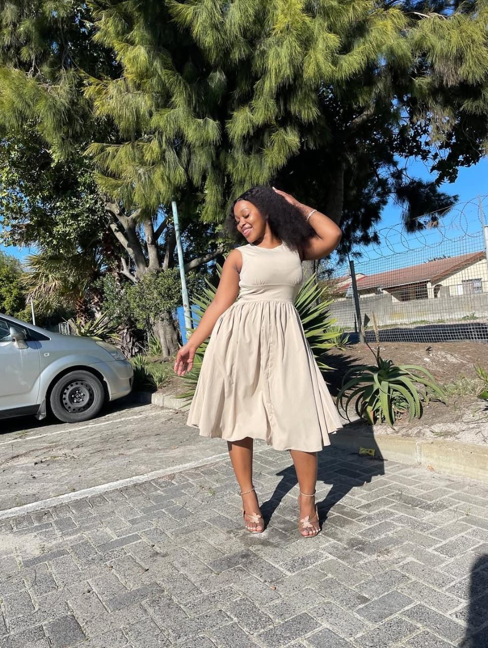 a sleeveless dress in a round neckline. The dress features a cinched waist and a flared, pleated skirt that falls around the knee or midi-length. The overall look is simple, elegant, and versatile, suitable for various occasions.