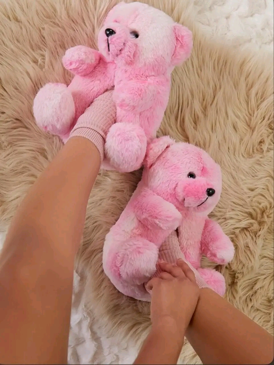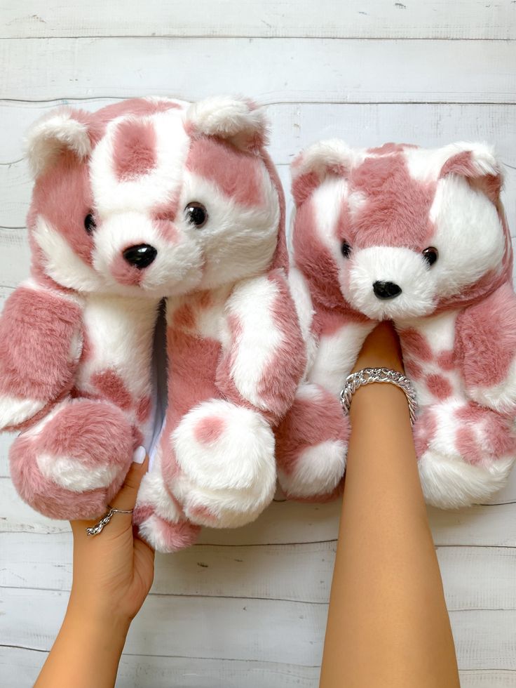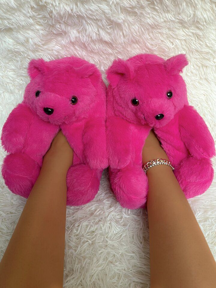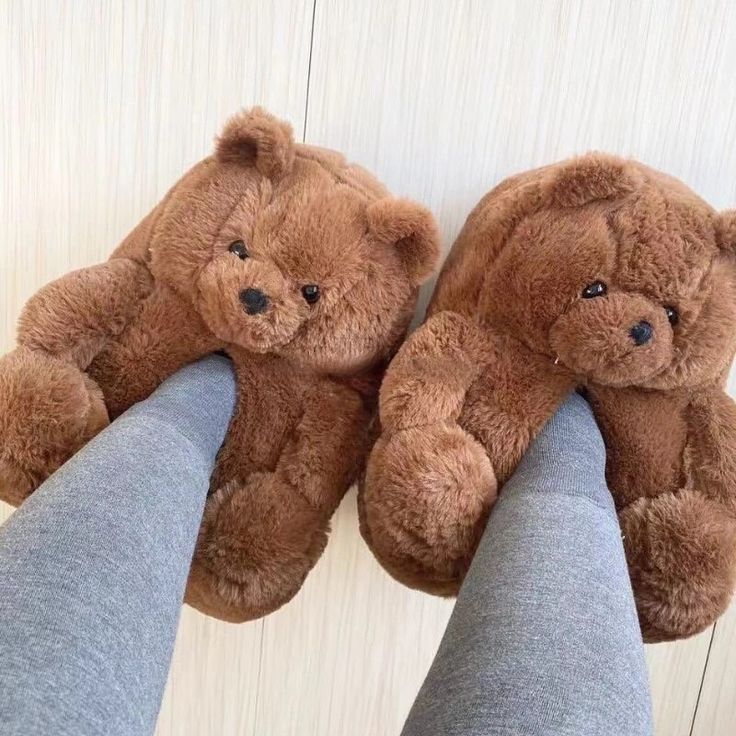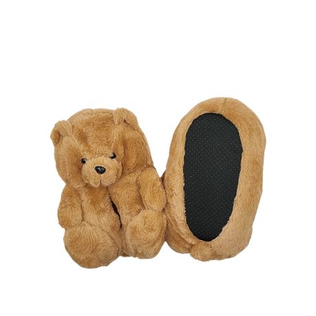 • Design: Each slipper is shaped like a sitting teddy bear, complete with a round head, small ears, black bead-like eyes, and a stitched nose.