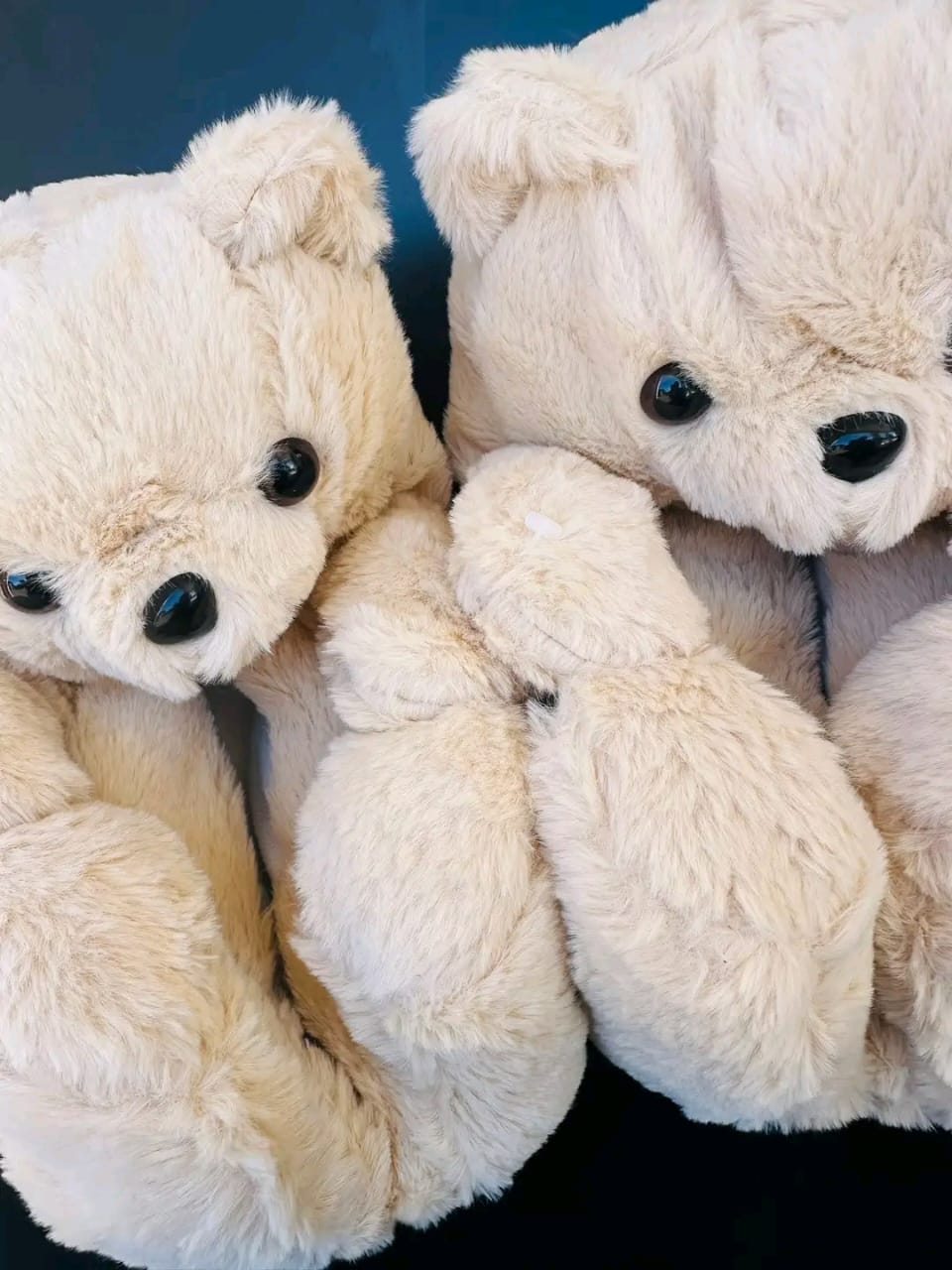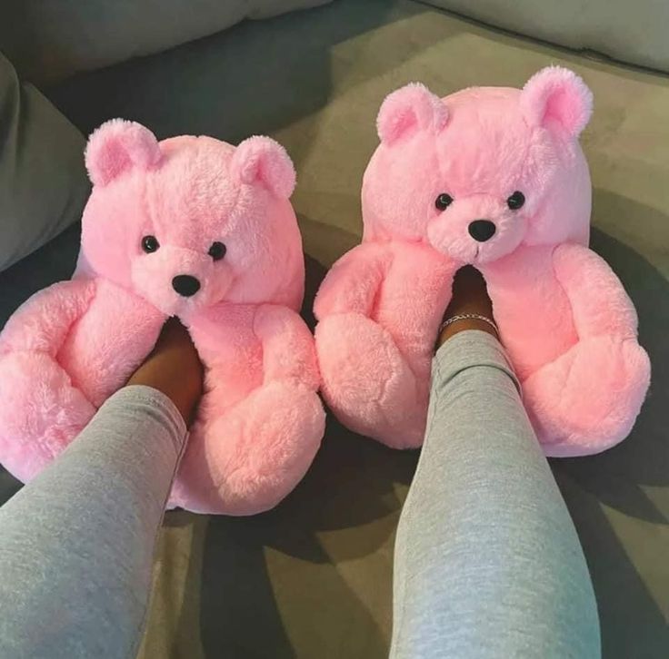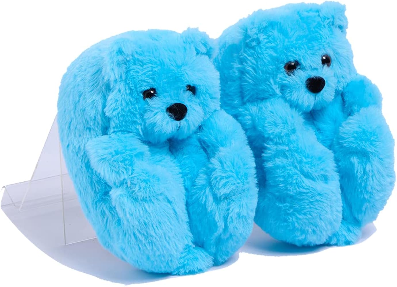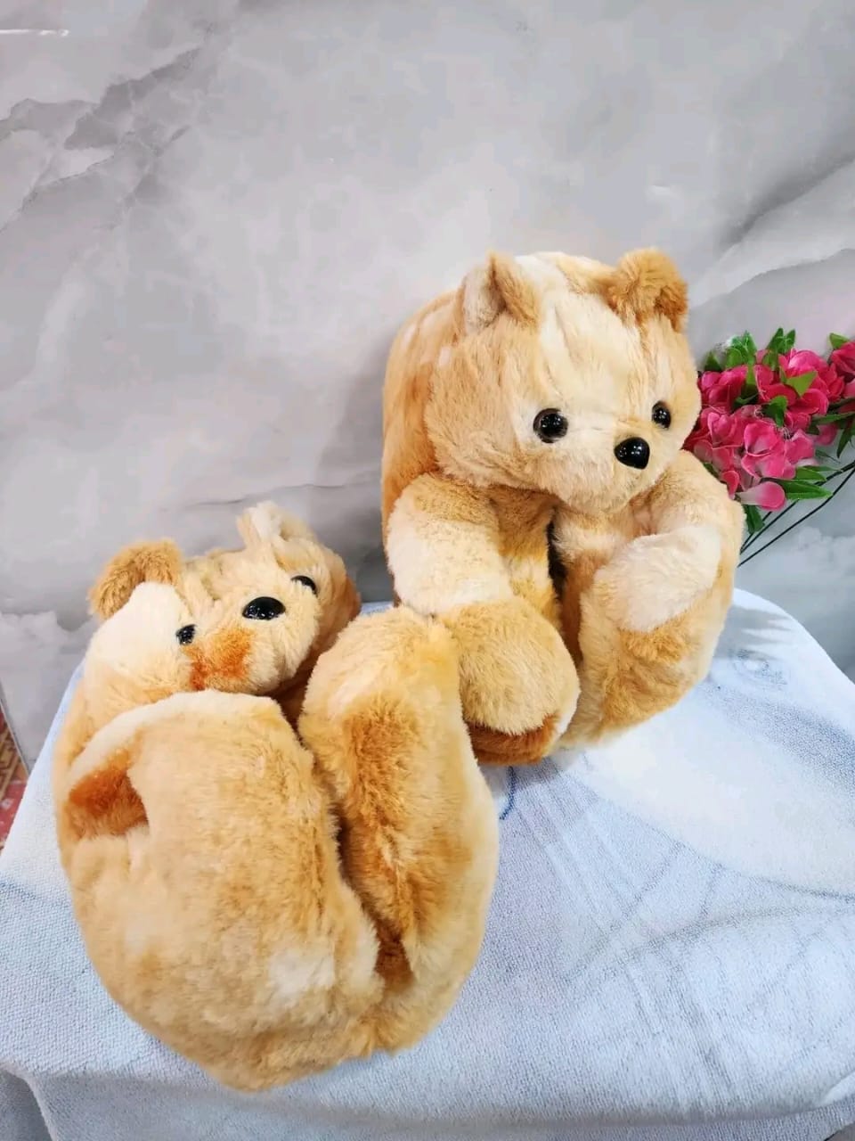 • Design: Each slipper is shaped like a sitting teddy bear, complete with a round head, small ears, black bead-like eyes, and a stitched nose.
