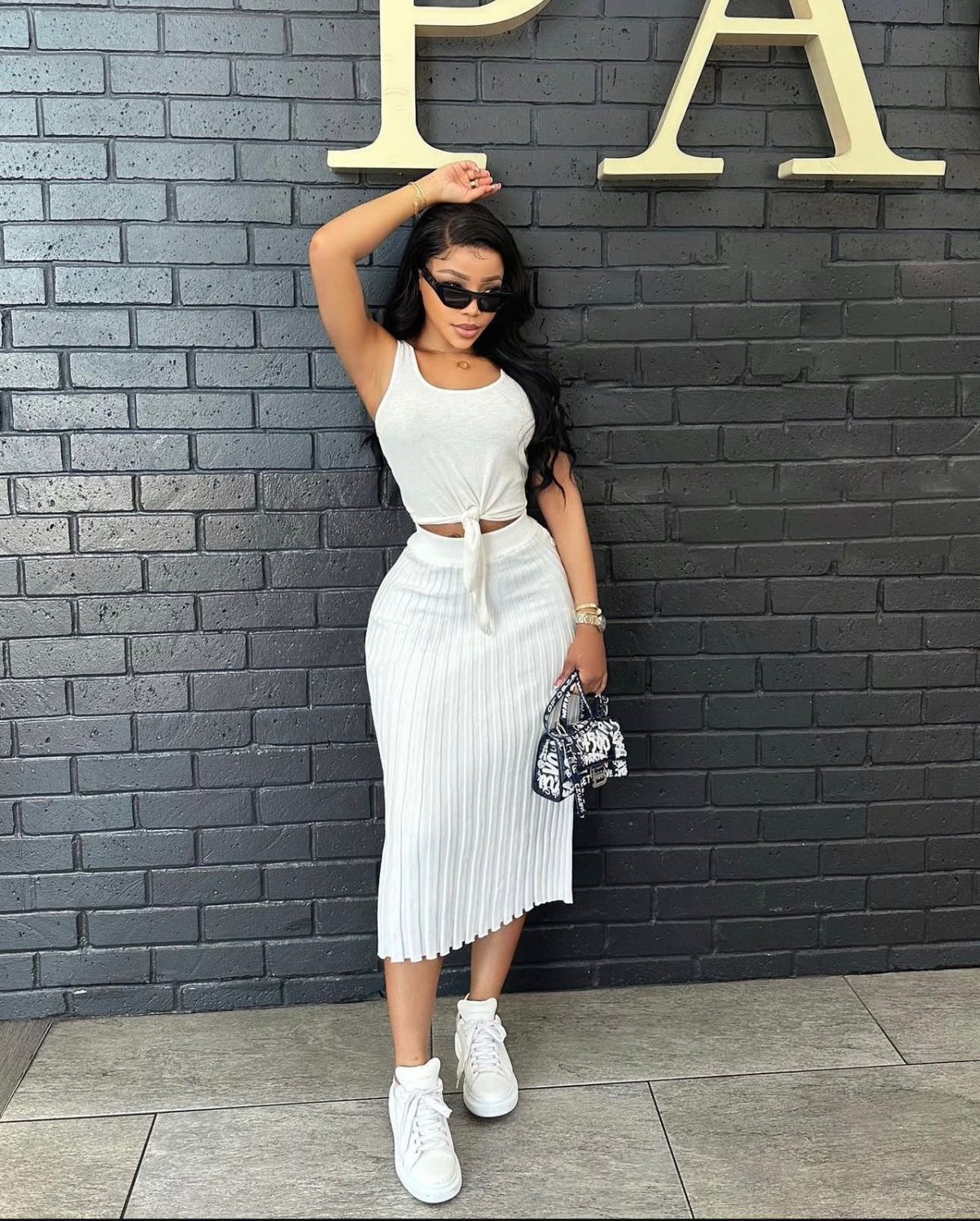 • Skirt: A high-waisted midi skirt that fits closely to the body. It is characterized by its ribbed-knit texture, which provides vertical lines that elongate the frame and offer a flexible, comfortable fit.