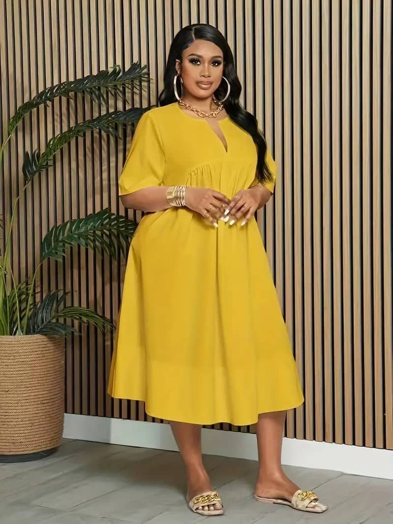 Brighten up your wardrobe with this midi dress. Featuring a flattering V-neckline and a comfortable, loose-fitting empire waist, this dress is designed for both style and ease. The smock-style bodice gives way to a flowing A-line skirt that ends in a subtle ruffle hem, creating a playful and feminine silhouette. With its short, elbow-length sleeves and a relaxed fit, this dress is perfect for a variety of casual and semi-formal occasions. Pair it with sandals for a relaxed daytime look or dress it up with heels and statement jewelry for an evening out.