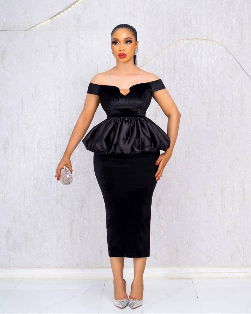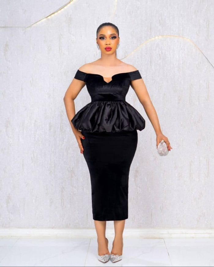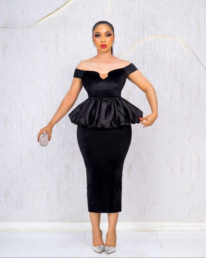 • Style: The dress features an off-shoulder neckline, a fitted bodice with a sweetheart-style V-bar detail, a ruffled peplum waist, and a pencil-style midi skirt.
